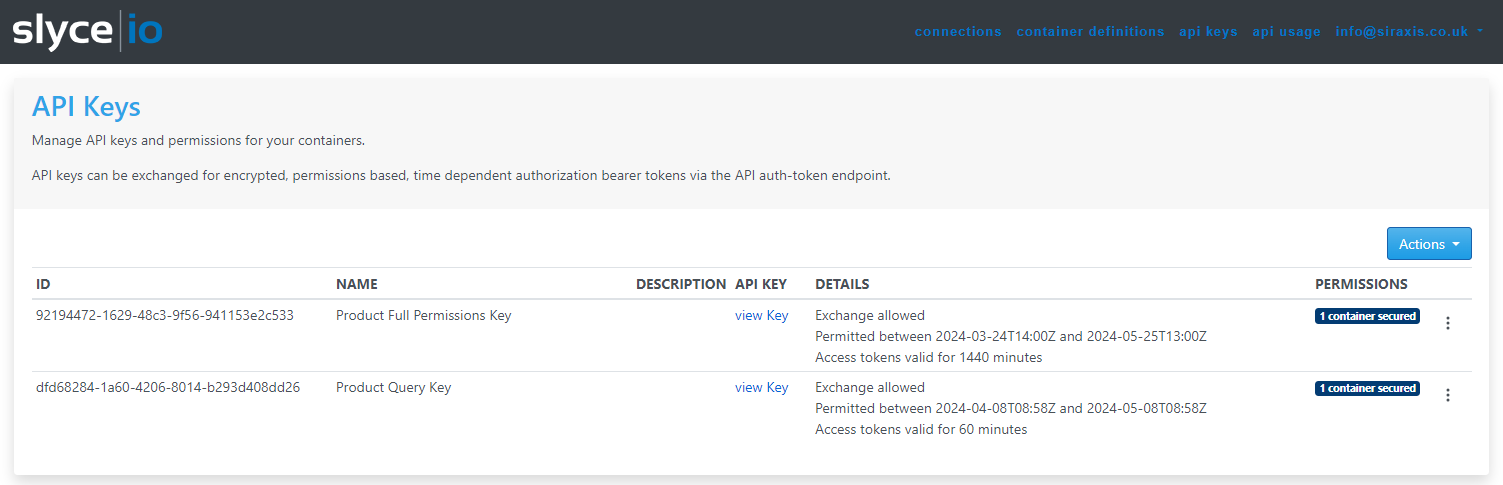 An API key details the exchange information, access token duration, container permissions and the physical key that is used for authentication. Use the authorization token endpoint to issue an encrypted bearer token for the required API key, which can then be used to access container data via the document endpoints.API Key Fields