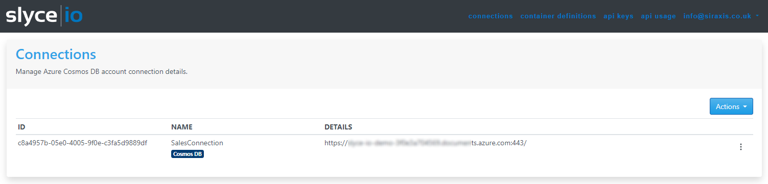 Creating a connection is your starting point and defines the Azure Cosmos DB account endpoint and key that is used for managing container definitions and associated query definitions within SlyceIO.Read/Write Azure Cosmos DB account keys are required for inserting, updating, deleting or querying container data.